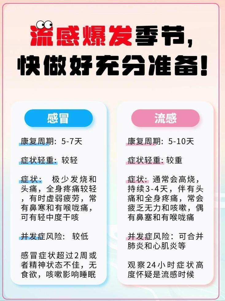 我们要先看以下流感不是普通感冒的差别,很多人将流感与普通感冒混为一谈,认为“扛一扛就过去了”。事实上,流感系由流感病毒引发的急性呼吸道传染病,其症状较普通感冒严重得多,诸如高热、头痛、肌肉酸痛、乏力等。更为关键的是,流感可能引发肺炎、脑炎、心肌炎等严重并发症,重症时会出现“白肺”现象,甚至致使患者死亡。