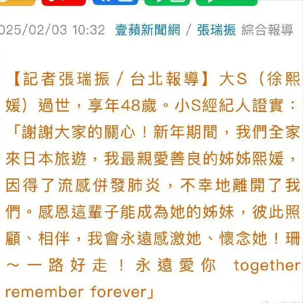 2025年2月3日,华人娱乐圈惊爆一则消息:台湾著名女艺人徐熙媛(大S)于日本因流感并发症逝世,享年48岁。