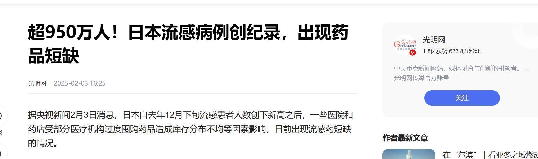 光明网2025-02-03-《超950万人!日本流感病例创纪录,出现药品短缺》