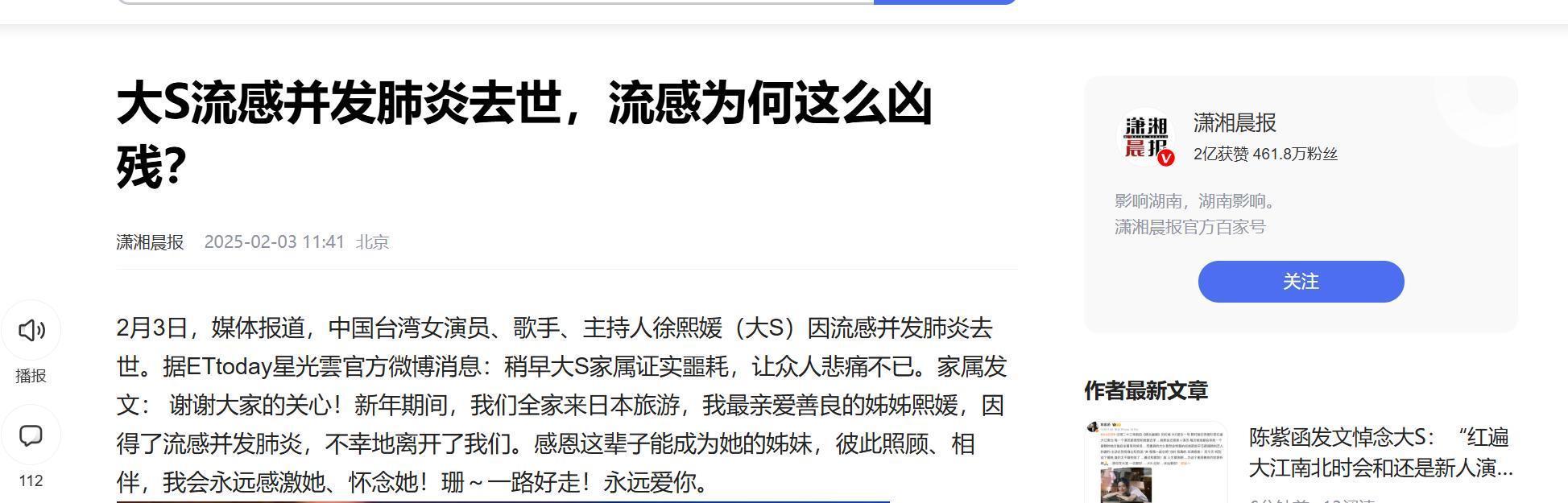 潇湘晨报2025-02-03-《大S流感并发肺炎去世,流感为何这么凶残?》
