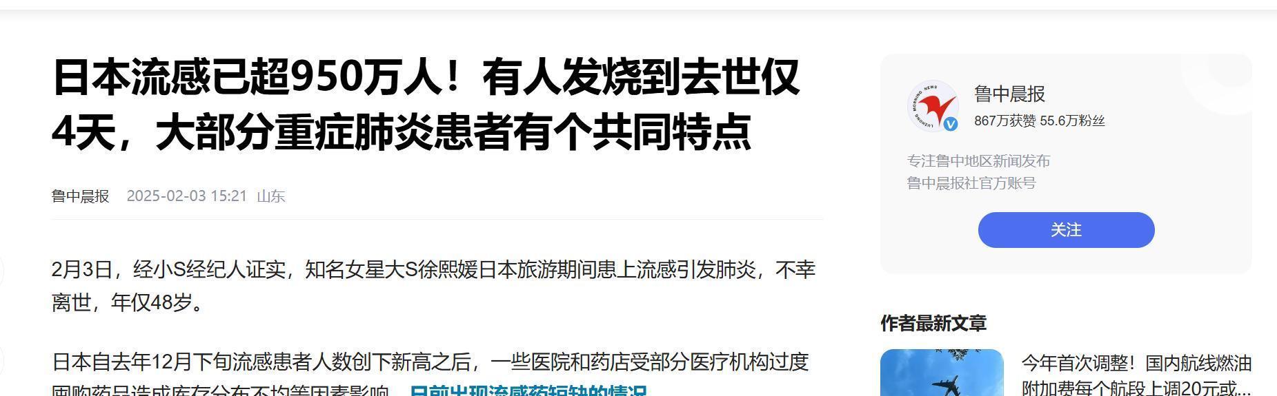 鲁中晨报2025-02-03-《日本流感已超950万人!有人发烧到去世仅4天,大部分重症肺炎患者有个共同特点》
