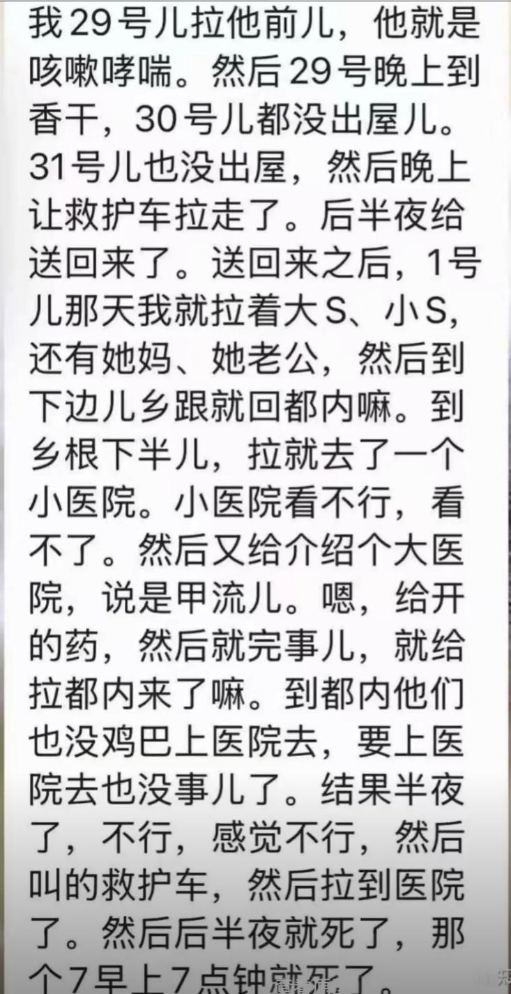 中间因为有所好转,就一直没有去,直到2月2日,大S 情况非常紧急,家人又一次叫了救护车,但是也是这天早上已经无力回天。