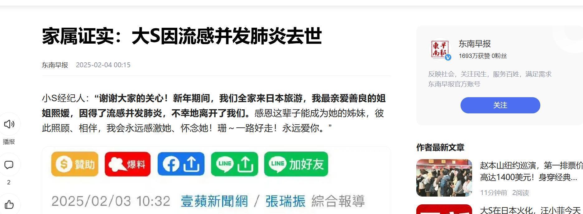 东南早报2025-02-04-《家属证实:大S因流感并发肺炎去世》